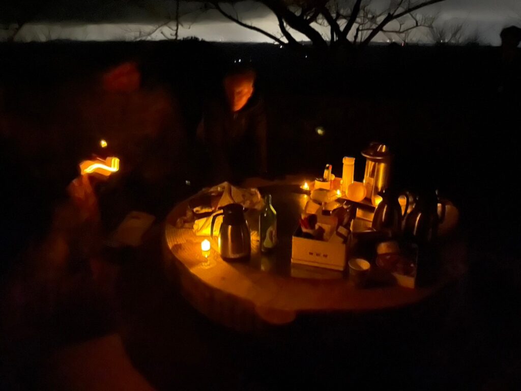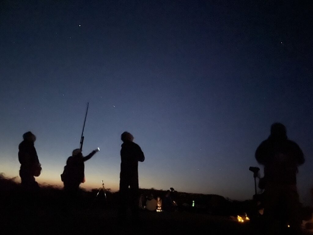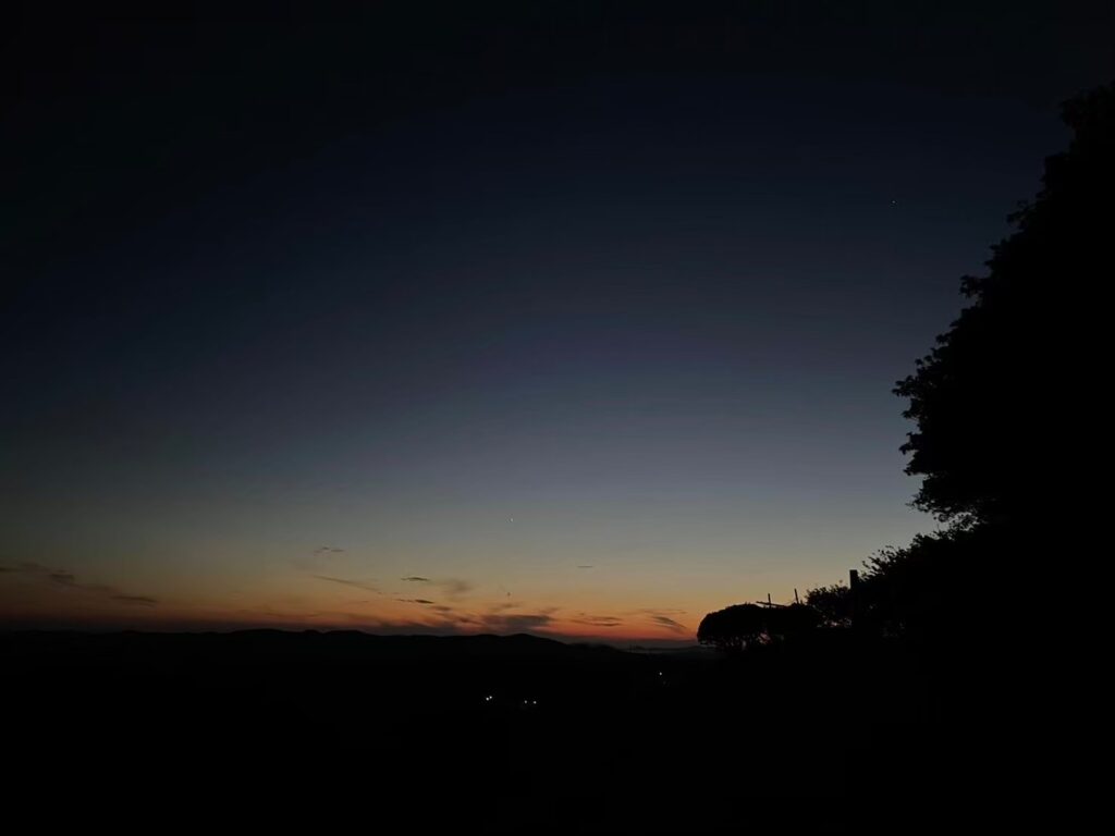 夕暮れから集合し、みんなでおしゃべりしながら山道を登ります。山頂にたどり着くと、目の前には、美しい夕陽。だんだんと夜になっていく空のグラデーションも素晴らしく、キラリと一番星がみえると、そこからが星空タイムのはじまり。