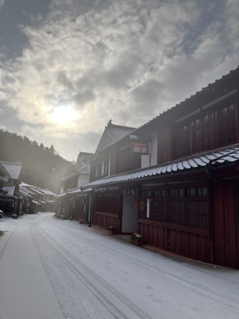 吹屋は標高約550m。12月~2月は気温が下がり、道路に雪が残っていることも。冬用タイヤの着用をおすすめします。冬の吹屋でしか見れない「赤と白」の景色に出会えるかもしれません。