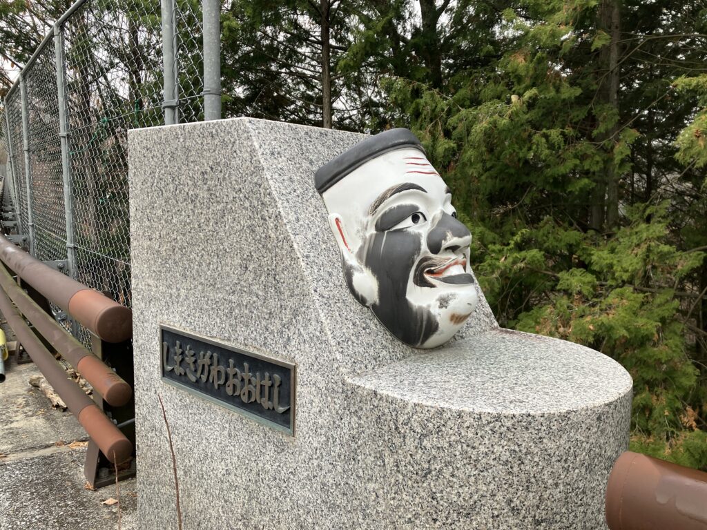 この島木川大橋は「かぐら街道」にあります。ここ高梁市成羽町は伝統芸能「備中神楽(かぐら)」発祥の地とされていることから、神楽面がデザインされています。
