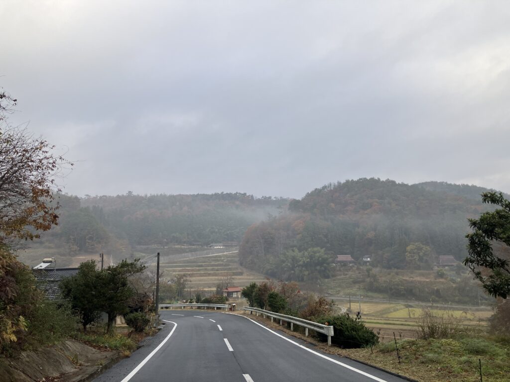 ドライブの終盤、吹屋ふるさと村まであと約5分のところです。この先、右手は田畑が広がっていて開放的で、色で季節を感じる素敵な場所です。