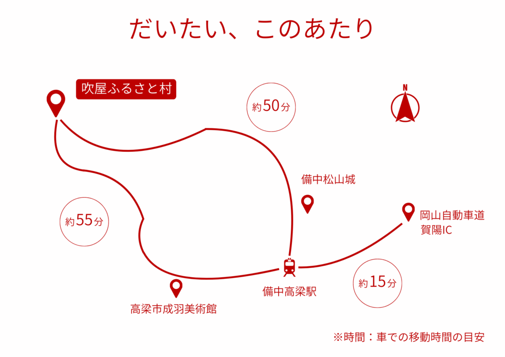 「赤い町」吹屋はJR備中高梁駅の北西、車で約50分のところに位置しています。「ちょっと遠いなあ・・・」と感じたそこの、あなた。実にもったいない。駅から離れ、山々を抜けて行った先に突如現れる緑に囲まれた「赤い町」。お客様からよく「本当にあるのか不安だったところに、いきなり現れてびっくりしました!」とのお声をよくいただきます。ワクワクの時間をぜひ味わってください。