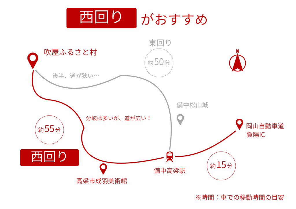 吹屋へは「西回り」と「東回り」のどちらからも行くことができます。時間もほとんど変わりません。「吹屋は山の中でしょ?山道に慣れてないから、少し不安・・・」と感じたそこの、あなた。【西回り】をおすすめします。分岐は多いですが、広い道路です。ただ、カーナビや地図アプリで「吹屋ふるさと村」を目的地に設定すると、通常「東回り」のルートで案内されます。そんなときは「高梁市成羽美術館」経由で設定してみてください。【西回り】ルートを案内してくれますので、ぜひご利用ください。