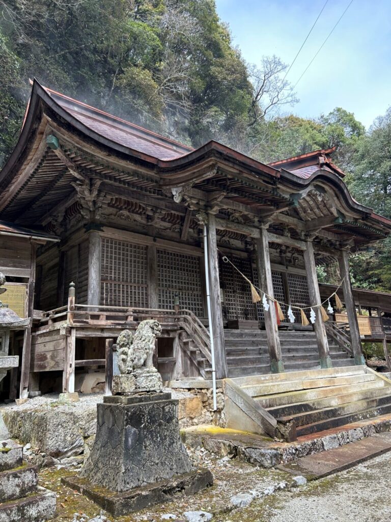 映画では、拝殿の外観が「若者がたどり着いた森の奥の神社」として登場しました。映画そのままの荘厳な雰囲気のある神社で圧倒されるような存在感があります。