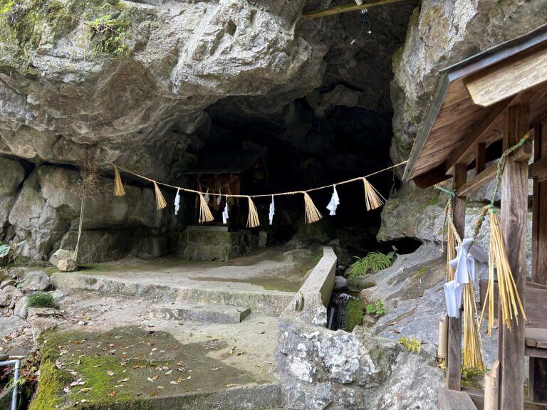 御神窟:穴門山神社の本殿の背後は切り立った岩壁で、脇には岩が大きく口を開けた鍾乳洞があり、御神窟として伊勢皇大神宮のご神体の神鏡が祀られている。