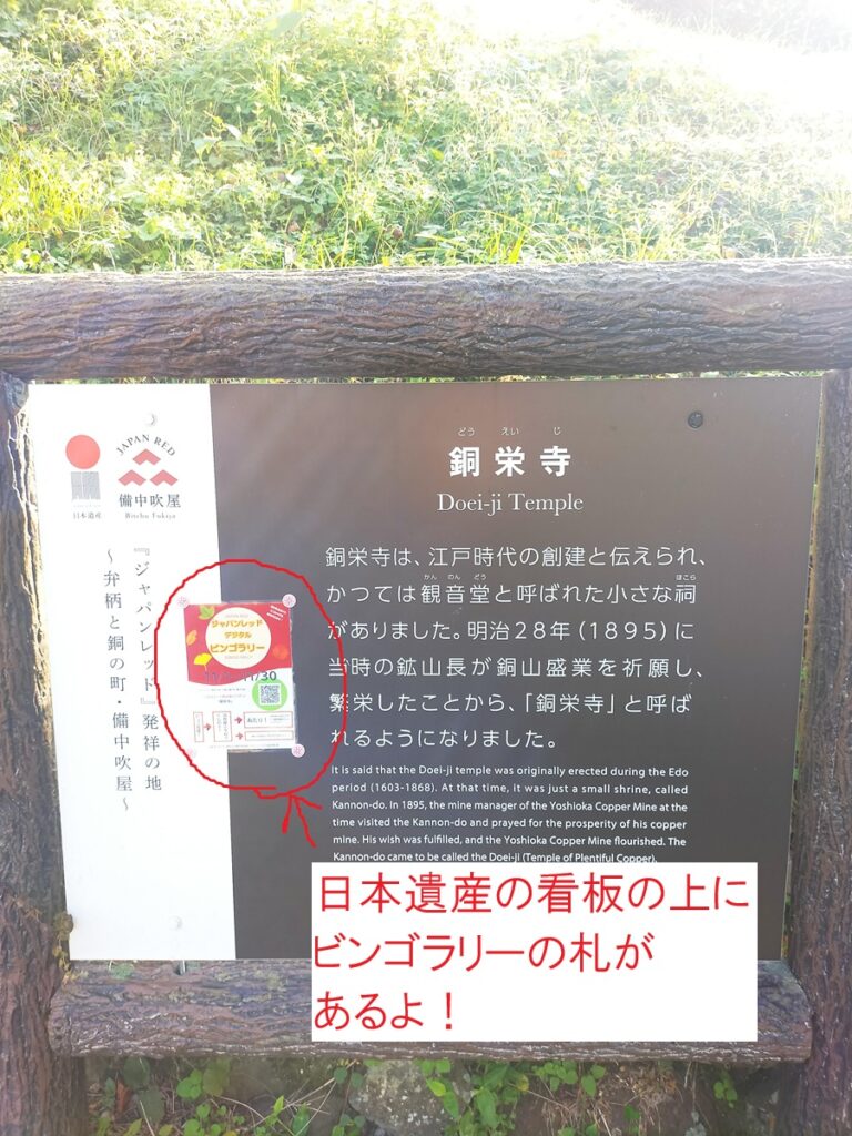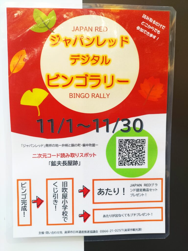 日本遺産「ジャパンレッド」発祥の地ー弁柄と銅の町・備中吹屋ーの構成文化財をめぐり、専用の二次元コードを取得することで参加できる3×3マスのビンゴラリーを開催しています。